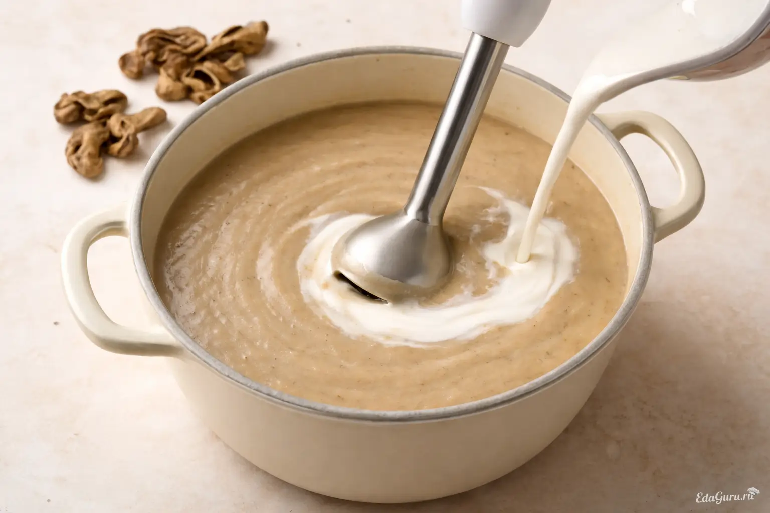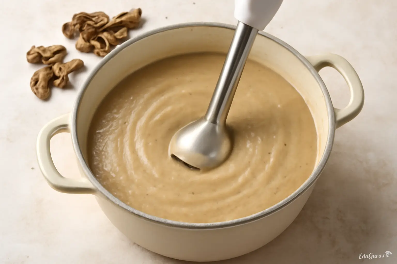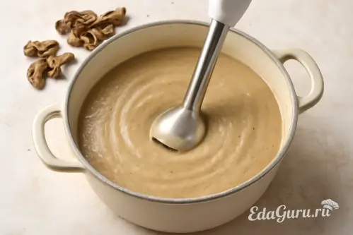 С помощью блендера измельчите крем-суп с добавлением сушеных белых грибов до однородной пюреобразной консистенции.