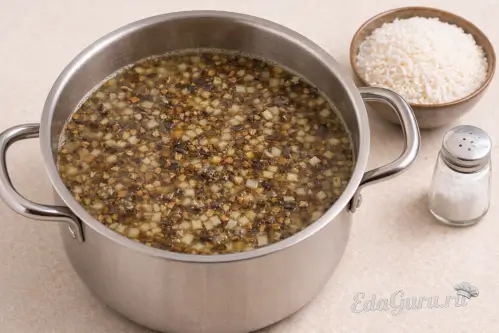 Удалите пену с поверхности, уменьшите огонь и дайте блюду покипеть на слабом огне в течение 35-40 минут. После этого всыпьте рис, посолите и продолжайте варить до его полной готовности.