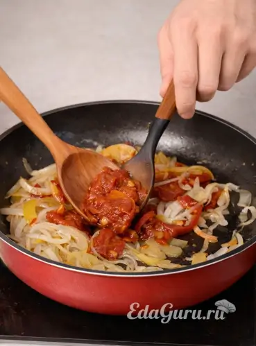 Очистите лук и нарежьте его тонкими перьями. В сковороде нагрейте сливочное масло и обжаривайте лук в течение 4-5 минут. Снимите кожу с соленых огурцов и удалите семена, нарежьте их тонкими полосками, добавьте к луку и готовьте ещё 3 минуты. Затем положите томатную пасту и, помешивая, тушите на среднем огне 2-3 минуты.