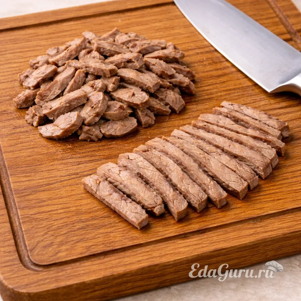 Процедите бульон через сито, перелейте обратно в кастрюлю и доведите до кипения. Пока бульон закипает, нарежьте язык и сваренное мясо тонкими полосками. Убедитесь, что мясо остыло, чтобы не обжечься.