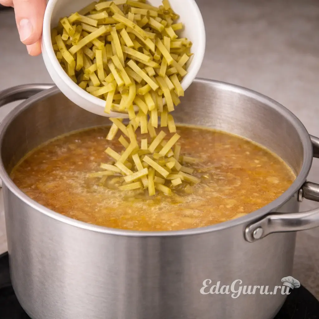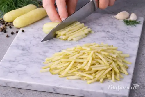Пока другие ингредиенты готовятся, аккуратно очистите огурцы от кожицы. Сложите кожуру в сотейник, залейте её стаканом кипящей воды и оставьте на 7-10 минут. Затем процедите получившийся отвар. Нарежьте огурцы соломкой и положите их в отвар, влейте огуречный рассол. Доведите всё до кипения и сразу снимите с плиты. Следите, чтобы огурцы не переварились.