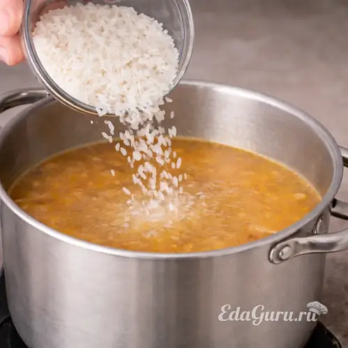 Тщательно промойте рис в теплой воде, добавьте его в суп. Продолжайте варить на среднем огне в течение 6-8 минут. Убедитесь, что рис не прилипает ко дну кастрюли, периодически помешивая.