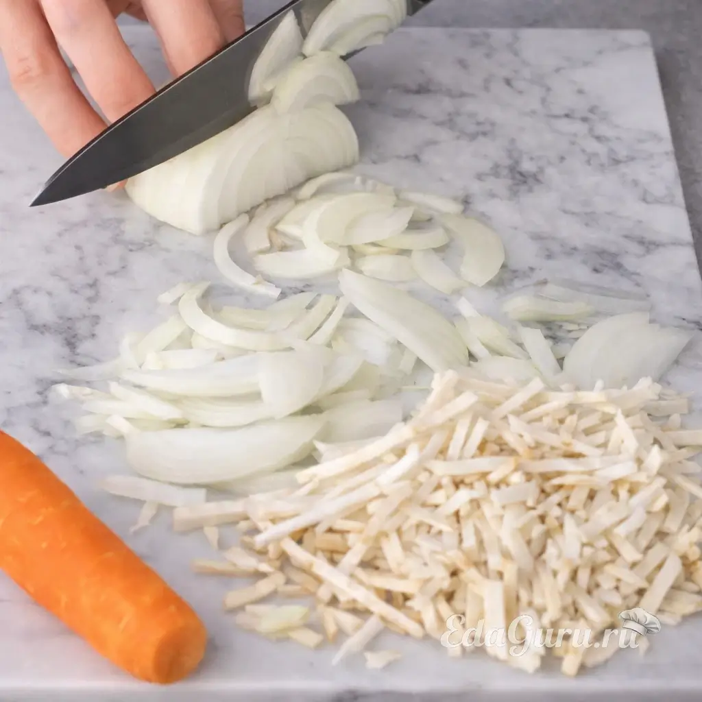 Пока потроха находятся на стадии варки, займитесь овощами. Очистите лук, морковь и сельдерей, а затем нарежьте их тонкой соломкой. Разогрейте сковороду и обжаривайте овощи в течение 5 минут. Затем переложите обжарку в кастрюлю с бульоном и дайте покипеть ещё 10-12 минут. Следите, чтобы овощи не пригорели, это может испортить вкус всего блюда.