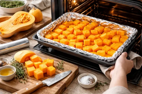 Тыкву, предварительно очищенную, разделите на равные по размеру кусочки, заверните их в фольгу и отправьте в духовку, заранее нагретую до 200 °С, на 40 минут.