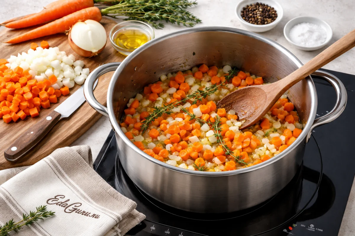 Лук с морковью произвольно нарежьте и отправьте в кастрюлю с разогретым растительным маслом. Добавьте тимьян и обжарьте все вместе.