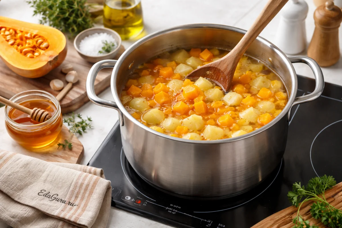 В кастрюлю влейте воду, положите нарезанный картофель и готовьте на слабом огне, пока овощи не станут мягкими. Под конец варки добавьте тыкву, соль и мед.