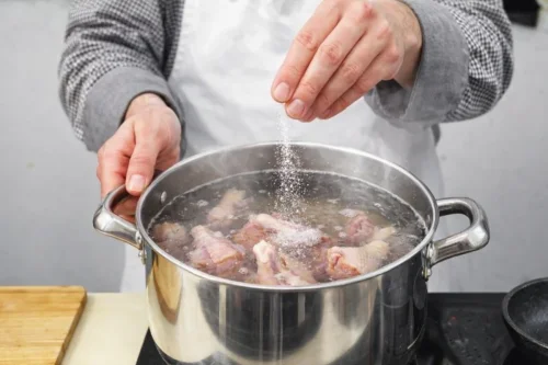 В большую кастрюлю поместите куриные кости и куски птицы, залейте водой, поставьте на средний огонь. Доведите до кипения и всыпьте щепотку сахара для балансировки вкуса.