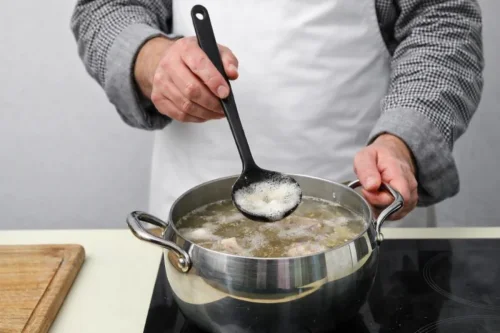 Уменьшите огонь до самого минимума, чтобы бульон не закипал, и в течение 15 минут аккуратно убирайте пену, которая появляется на поверхности.