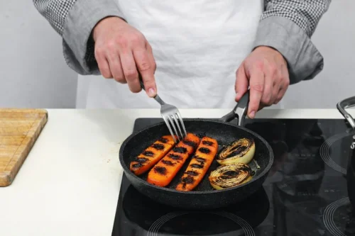 Разрежьте морковь и луковицы вдоль на две части и прижгите на раскалённой сковороде до появления чёрных следов.