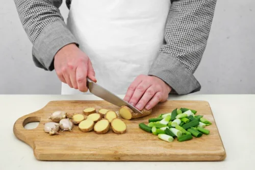 Имбирь нарежьте кусками толщиной около 15 мм, оставив кожицу. Зеленый лук следует нарезать также крупно. Чеснок слегка придавите ножом, не снимая шелуху.