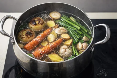 В бульон погрузите все ранее обработанные овощи, и те что прижигались на сковороде. Оставьте кастрюлю на плите на самом слабом огне, не накрывая крышкой, чтобы бульон не подавал признаков кипения. Варите 2,5 — 4 часа. Чем дольше, тем более насыщенный получится.