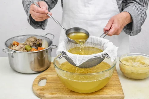 Охладите бульон и процедите его. Дуршлаг, сито, марля вам в помощь.