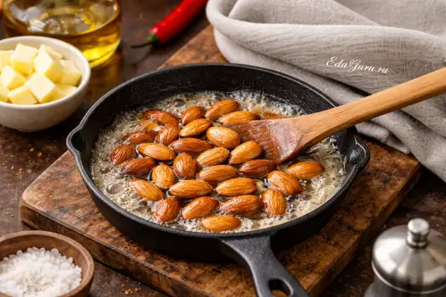 На маленькой сковороде растопите сливочное масло. Как только увидите, что оно начало пениться, добавьте миндальные орехи. Жарьте их до тех пор, пока они не приобретут золотисто-коричневый оттенок. Уберите сковороду с плиты и дайте миндалю остыть.