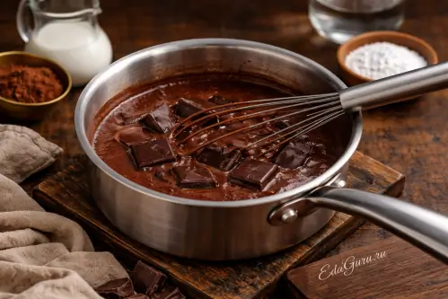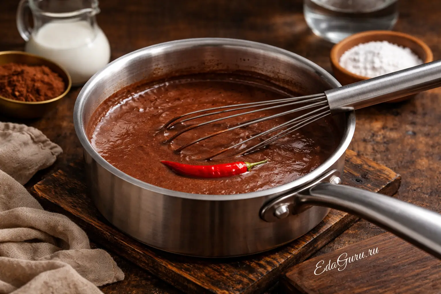 В кастрюлю добавьте какао-порошок, сахарную пудру, сливки, стакан воды и часть перца чили, затем поставьте на сильный огонь. Размешивайте до тех пор, пока смесь не станет однородной. Держите на огне 3-3.5 минуты, после чего снимите.