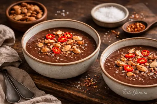 Шоколадный суп с соленым миндалем и перцем чили — десерт с ярким контрастом вкусов: густой шоколадной основой, ореховой ноткой и мягкой остротой. Такое сочетание не случайно: какао в Мезоамерике изначально употребляли именно как напиток, причем нередко с пряностями, включая перец чили. В Европу шоколад пришел позже и уже там стал основой для более сладких, сливочных версий блюд и напитков. Миндаль с шоколадом — классическая гастрономическая пара: их объединяют насыщенный вкус и приятная текстурная контрастность. Подсаливание миндаля делает вкус еще выразительнее, подчеркивая глубину темного шоколада. Поэтому в таком супе хорошо работают сразу три акцента: горчинка какао, солоноватый хруст орехов и деликатное тепло чили.