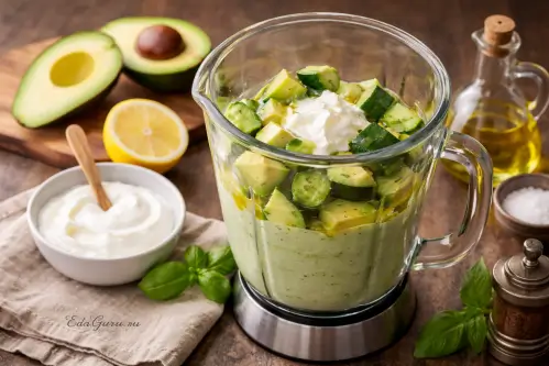 Холодный суп из авокадо и цукини — современное легкое блюдо в духе летних супов-пюре. Его основа понятна: авокадо дает нежную, маслянистую текстуру, а цукини — мягкий овощной вкус без лишней тяжести. Авокадо родом из Мексики и других районов Америки, где его выращивали задолго до прихода европейцев. Цукини, хотя и воспринимается как типично европейский овощ, относится к летним тыквам Нового Света, а само слово zucchini пришло из итальянского языка. Поэтому такой суп можно считать удачным соединением продуктов с американскими корнями и средиземноморской кулинарной привычкой готовить легкие овощные блюда. Подача в холодном виде делает его особенно уместным в жаркую погоду: вкус получается свежим, кремовым и очень деликатным.