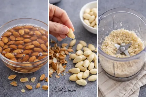 Залейте миндаль кипятком на 4-5 минут, после чего снимите кожицу: слегка сожмите орех большим и указательным пальцами, и ядро легко выйдет наружу. Несколько миндалин сразу оставьте для украшения, а остальной миндаль измельчите в блендере. Если орехи очищаются плохо, подержите их в горячей воде еще немного.