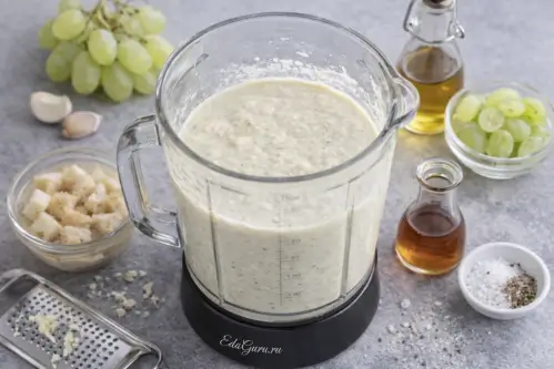 К миндалю добавьте хересный уксус, 3/4 винограда, чеснок, натертый на мелкой терке, замоченный хлеб не сливая воду, оливковое масло, перец и соль. Пробейте все до полностью однородной массы — она должна получиться довольно густой. После этого гаспачо можно либо сразу подавать, либо убрать прямо в чаше блендера в холодильник, чтобы он немного настоялся.