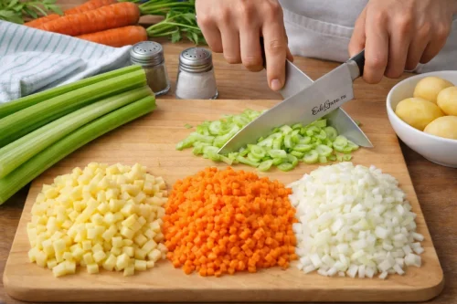 Очистите лук, морковь и картофель, затем нарежьте их небольшими ломтиками. Сельдерей хорошо промойте и нарежьте тонкими колечками.
