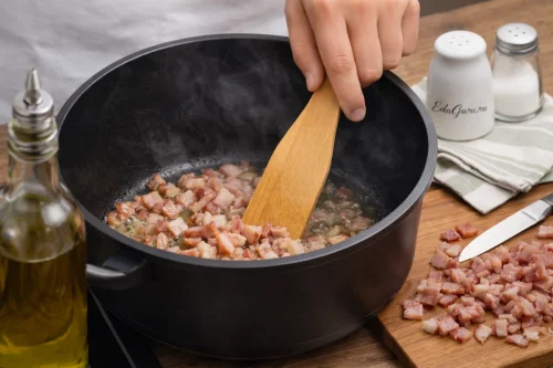 Порежьте бекон на маленькие кусочки и обжарьте их в кастрюле на разогретом оливковом масле в течение четырех минут. Следите, чтобы бекон не подгорел, и при необходимости перемешивайте.