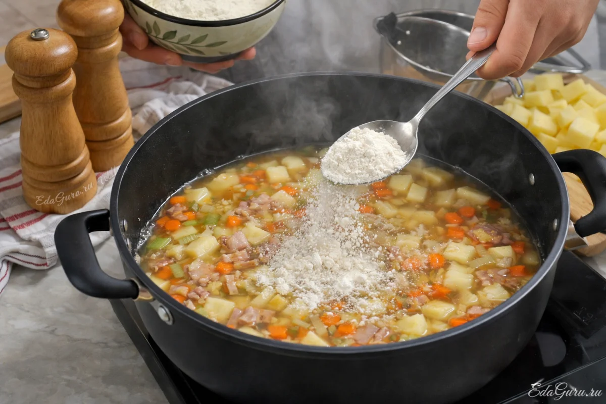 К обжаренному бекону добавьте нарезанные овощи. Жарьте, постоянно перемешивая, на среднем огне в течение десяти минут. Затем добавьте муку, хорошенько перемешайте и продолжайте обжаривать еще семь минут. Аккуратно, при постоянном помешивании, влейте два литра горячей воды в кастрюлю. Доведите до кипения и добавьте картофель, варите пять минут.