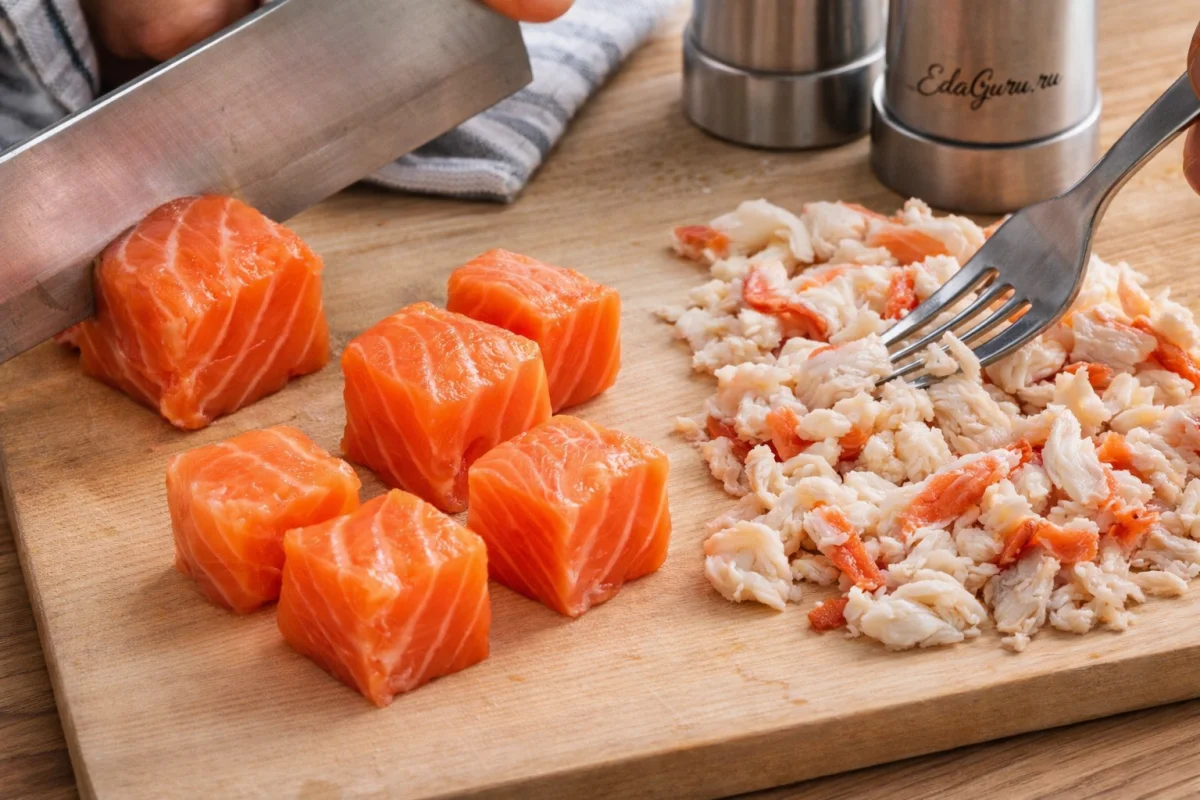 Порежьте филе форели на большие куски. Крабовое мясо разберите на маленькие части.