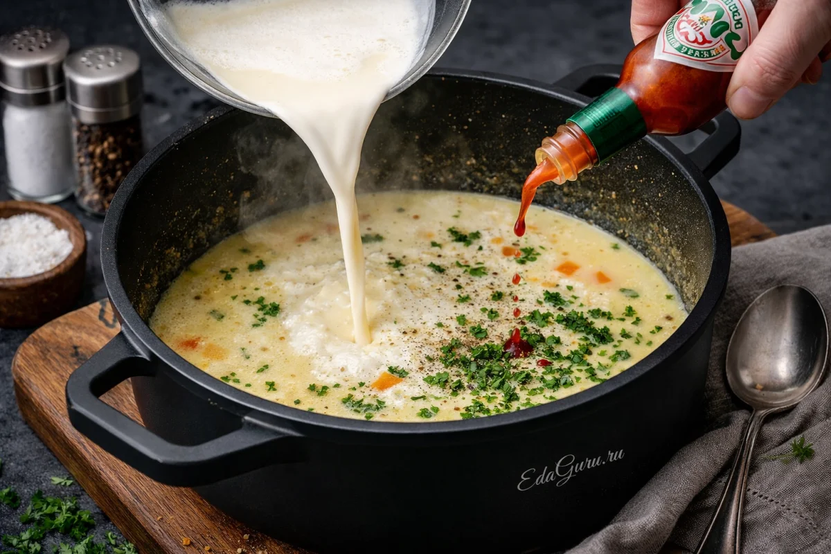 В небольшой кастрюле объедините молоко и сливки, нагрейте до закипания, затем аккуратно влейте в суп. Добавьте немного табаско для остроты, а также перец и соль по вкусу, и дайте покипеть минуту. Перед подачей украсьте зеленью. Обратите внимание, чтобы не переварить, иначе суп может стать слишком густым.