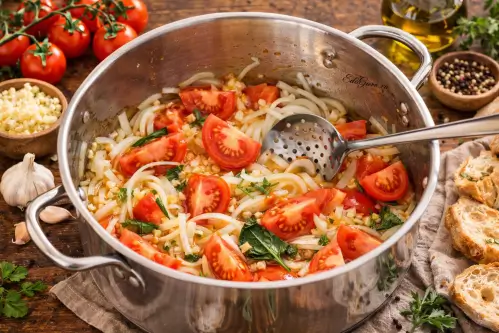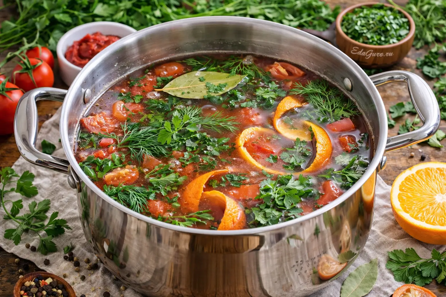 Положите в кастрюлю томатную пасту и помидоры, затем уменьшите огонь. Добавьте три л воды, после чего добавьте лавровый лист, апельсиновую кожуру, петрушку и укроп. Следите, чтобы после добавления жидкости содержимое прогревалось равномерно, без бурного кипения.