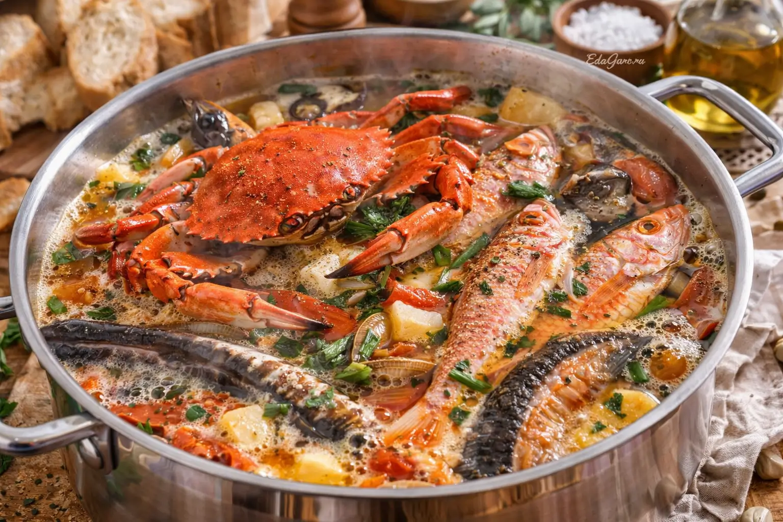 Главное в приготовлении буйабеса — точно следовать рецепту и последовательности шагов. Если каких-то видов рыбы не хватает, это допустимо. Но заменять их другой рыбой без необходимости не стоит, при этом лангусты можно добавить. Если вас смущают кости от мелкой рыбы, процедите бульон через сито, а оставшуюся рыбу лучше промять.