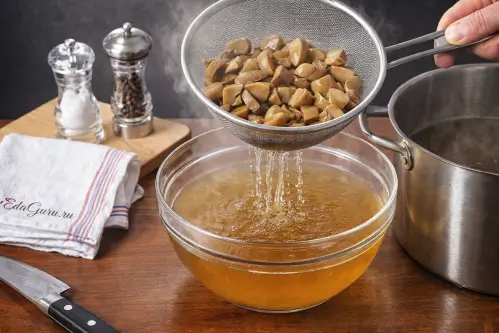 Очистите грибы и нарежьте их на средние кусочки. Вскипятите 2,5 литра воды и погрузите грибы в кипяток. Варите их в течение 40 минут. После этого откиньте грибы на дуршлаг, чтобы избавиться от лишней жидкости, а бульон процедите через сито.