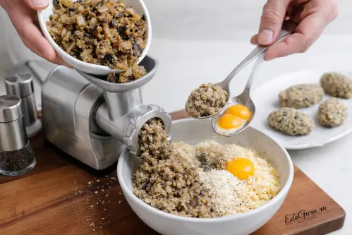 Пропустите обжаренные грибы с луком через мясорубку, чтобы получить однородный фарш. Затем приправьте его солью и перцем по вкусу, добавьте натертый сыр, панировочные сухари и два желтка. Тщательно перемешайте массу. Если она кажется слишком сухой, можно добавить еще один желток. Сформируйте из фарша кнели, используя две ложки.
