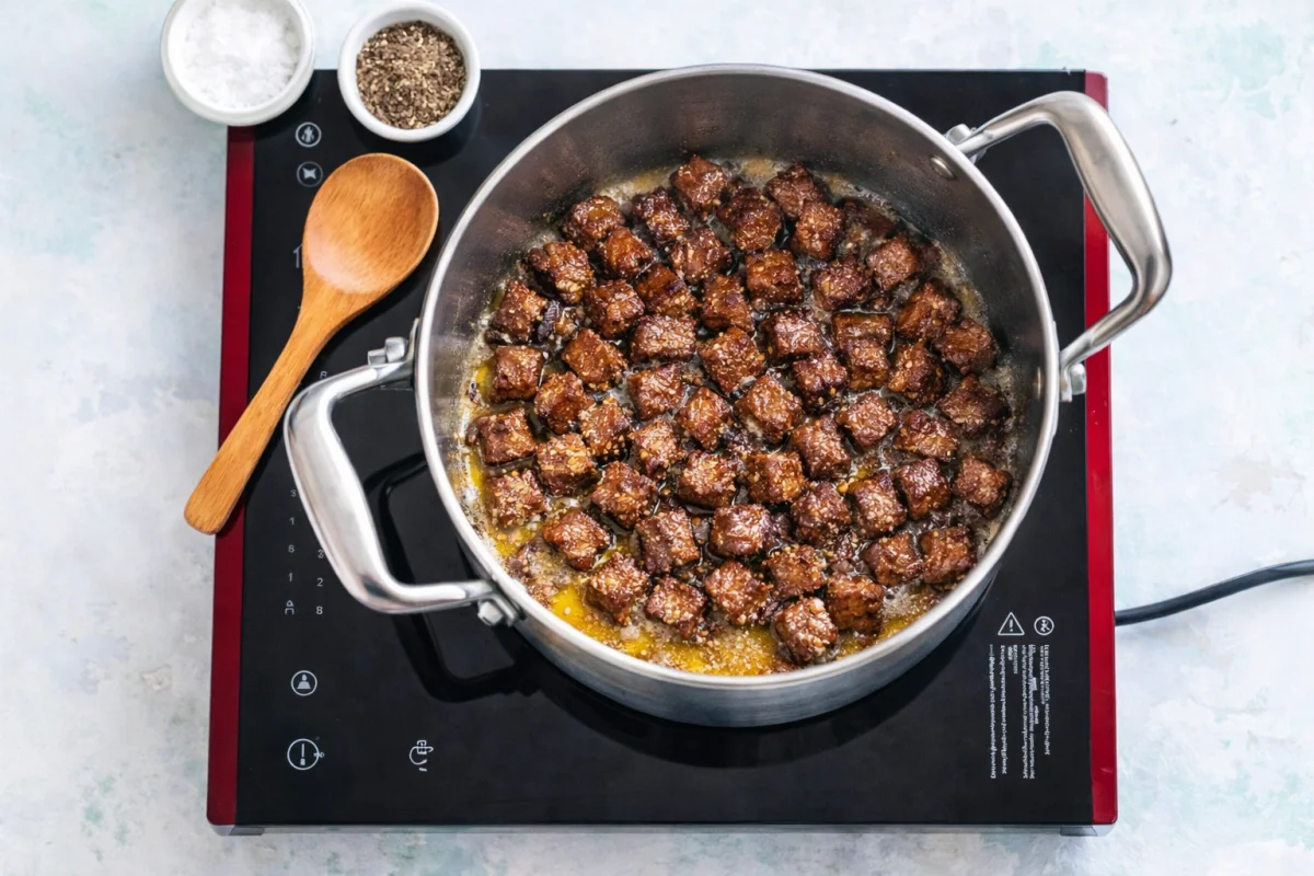 Порежьте говядину на маленькие кубики. Поперчите и посолите. На оливковом масле в кастрюле жарьте мясо до образования золотистой корочки.