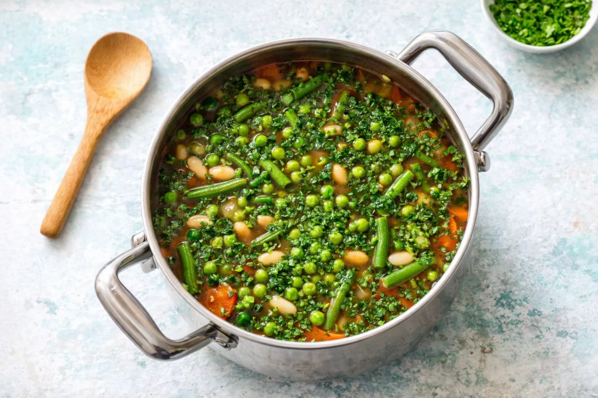 Положите в суп стручковую фасоль и зеленый горошек и варите их в течение 3-5 минут. После этого снимите кастрюлю с плиты и посыпьте суп измельченную петрушку.