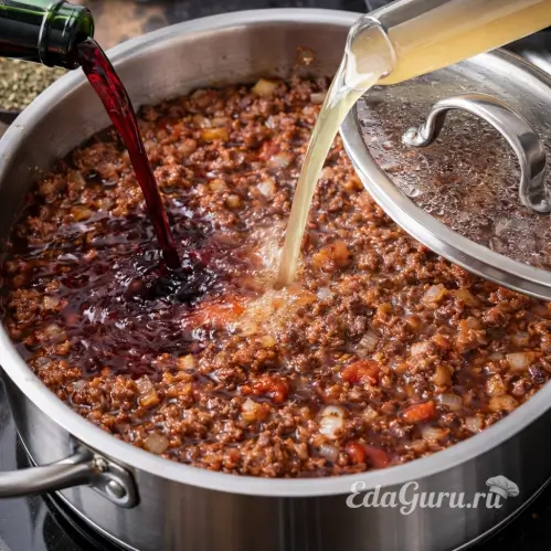 Добавьте в кастрюлю с обжаркой красное вино. Затем влейте бульон и доведите смесь до кипения. Далее убавьте температуру, накройте кастрюлю крышкой и оставьте вариться на полчаса. Следите, чтобы огонь был не слишком сильным, чтобы соус не выкипел.