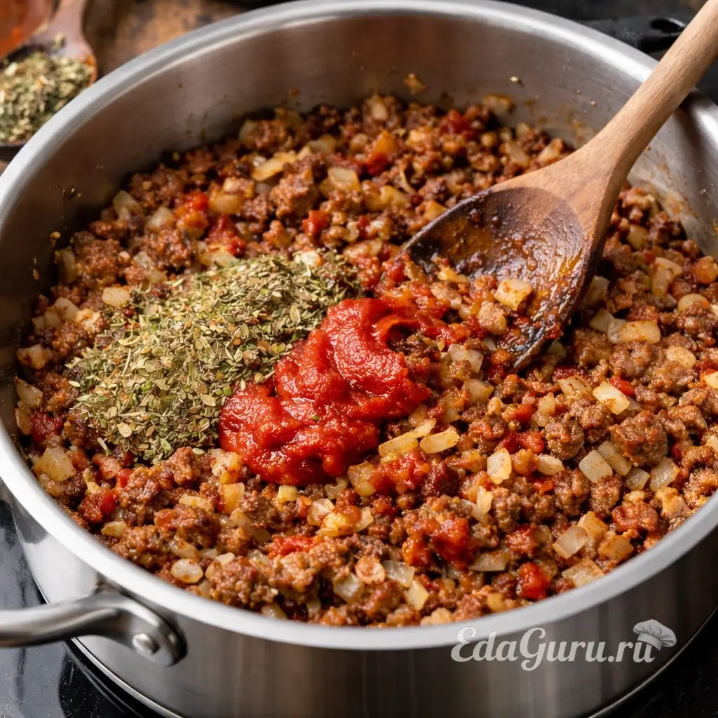 Почистите лук и чеснок, затем измельчите. Когда говядина приобретет золотистый оттенок, добавьте чеснок и лук и обжаривайте в течение 4-6 минут. Далее положите томатную пасту и смесь прованских трав, продолжая готовить и помешивая еще пару минут. Следите, чтобы ничего не пригорело.