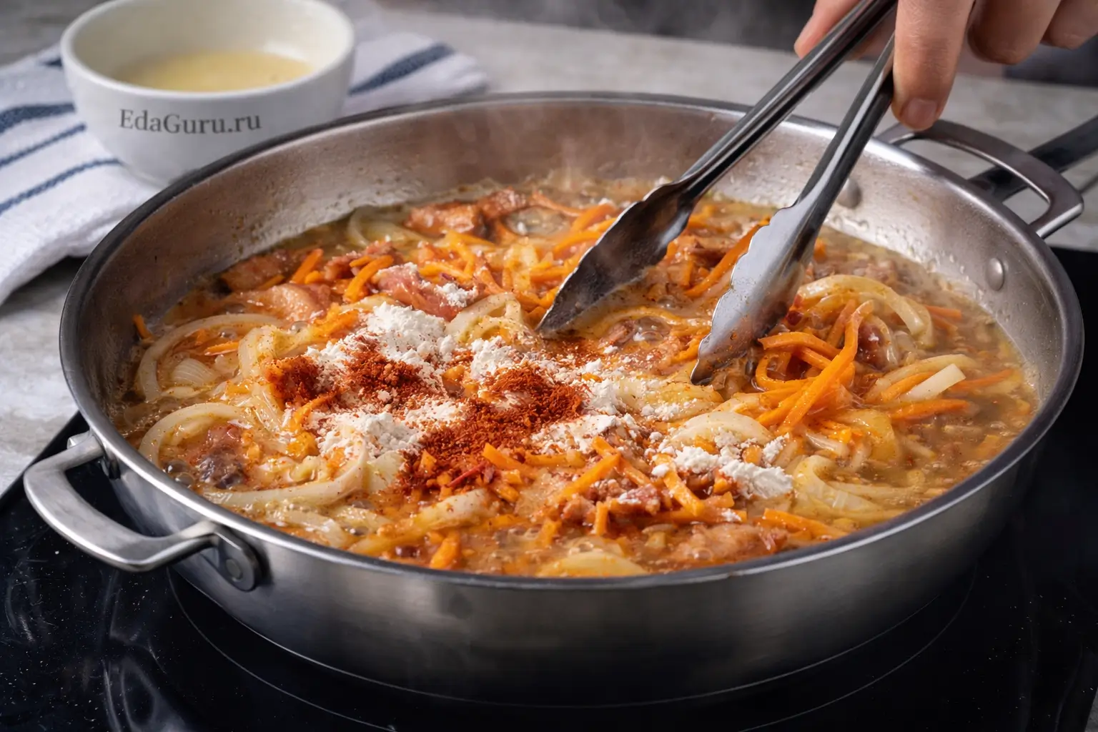 Разогрейте сковороду и обжарьте сало в течение 2-3 минут. Добавьте морковь и лук, готовьте ещё 5 минут. Посыпьте смесь мукой и паприкой, хорошо перемешайте. Влейте сто мл. бульона и снова перемешайте, снимите сковороду с плиты.