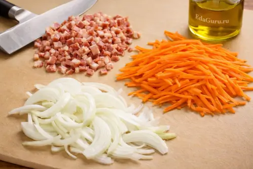 Шпик порежьте на маленькие кусочки. Лук нашинкуйте полукольцами, а морковь нарежьте соломкой.