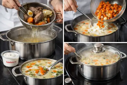 Достаньте мясо и овощи из бульона, а сам бульон процедите. Поставьте его обратно на плиту, дайте закипеть. Затем добавьте сливки, сметану и обжаренные овощи. Всё перемешайте и готовьте на слабом огне под крышкой в течение 4-6 минут.