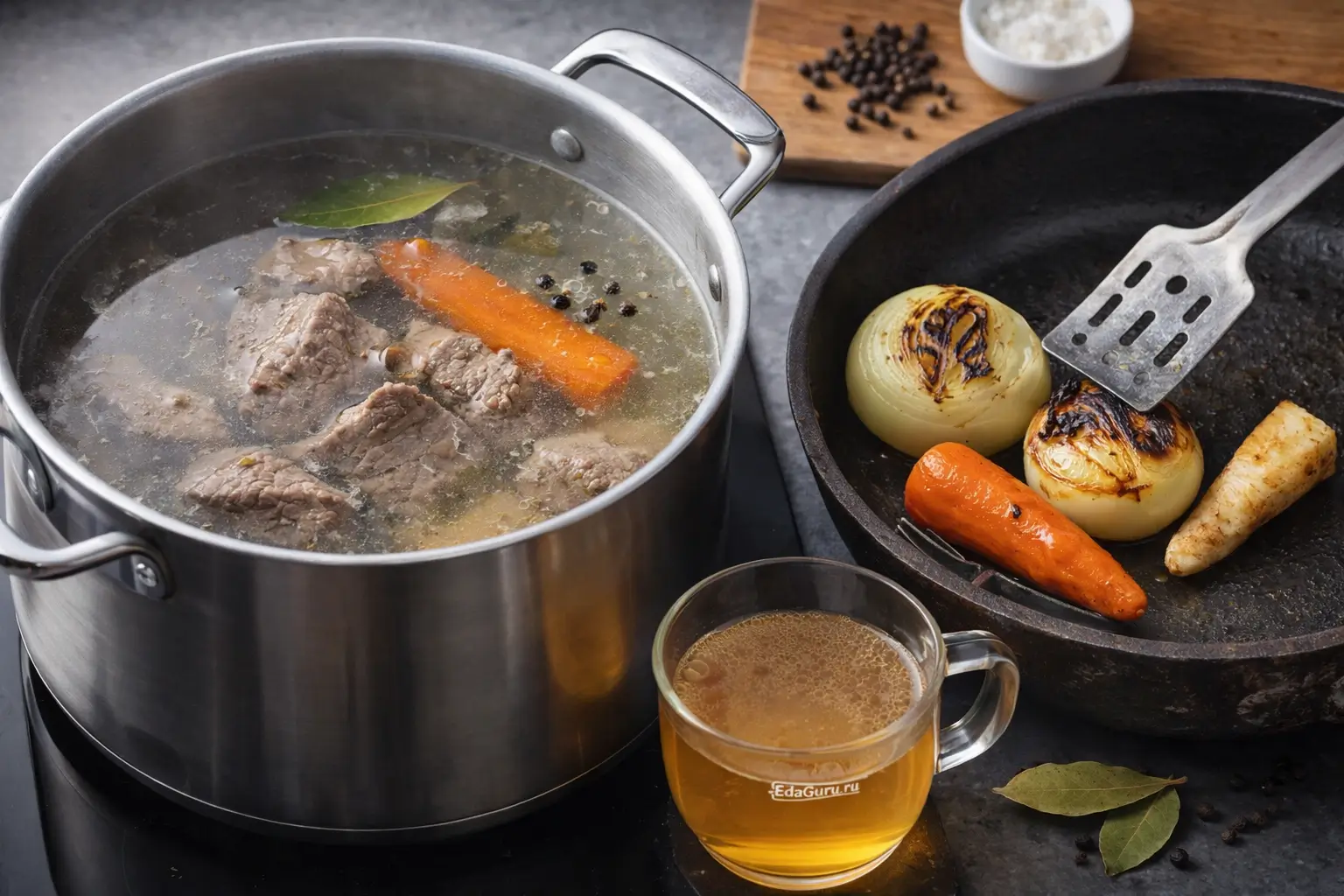 Промытую говядину варите в трехлитровой кастрюле, снимая образовавшуюся пену. Отлейте 100 мл бульона, он нам еще пригодится. Очистите луковицу, корень петрушки и морковь. На раскалённой сковороде в течение пяти минут обжарьте овощи целиком, затем добавьте их в бульон, уменьшите огонь до среднего и продолжайте варить в течение часа. За десять минут до окончания варки положите в кастрюлю лавровый лист и несколько горошин чёрного перца.