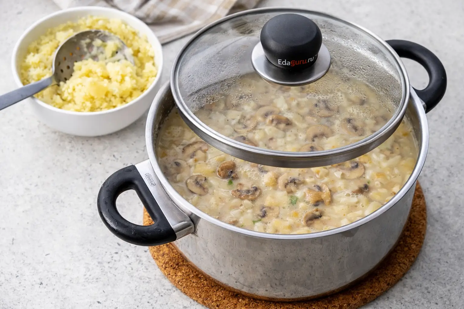 С помощью шумовки выньте картошку из воды и растолките её в отдельной ёмкости до состояния пюре. Верните картофельное пюре в кастрюлю, добавьте туда грибы, обжаренные с луком, и рис. Дайте супу закипеть и перемешайте, продолжайте варить на среднем огне ещё минут десять. После этого уберите кастрюлю с плиты и накройте крышкой. Оставьте на 4-6 минут, чтобы он настоялся.
