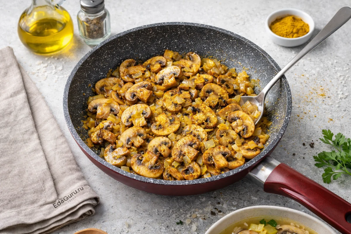 Мелко нарежьте лук и обжарьте его на сковороде с маслом в течение 5 минут, пока он не приобретет золотистый цвет, не забывайте помешивать. Затем добавьте грибы и обжаривайте 8-12 минут. Приправьте по вкусу солью, перцем, карри, далее перемешайте и снимите с плиты. Грибы старайтесь не пережарить — они должны оставаться сочными.