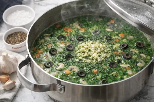 Влейте пюре из шпината и добавьте маслины, доведите до кипения и сразу же уберите с плиты. Приправьте солью и перцем по своему усмотрению, добавьте подготовленный чеснок, накройте крышкой и оставьте на десять минут.