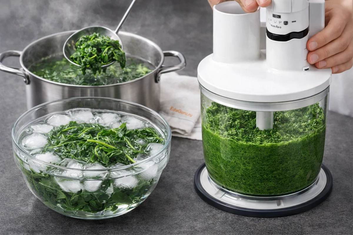 Промойте шпинат, затем на полминуты погрузите его в кипяток. После этого сразу поместите в емкость с холодной водой, чтобы остановить процесс варки. Используя блендер, измельчите шпинат до состояния пюре.