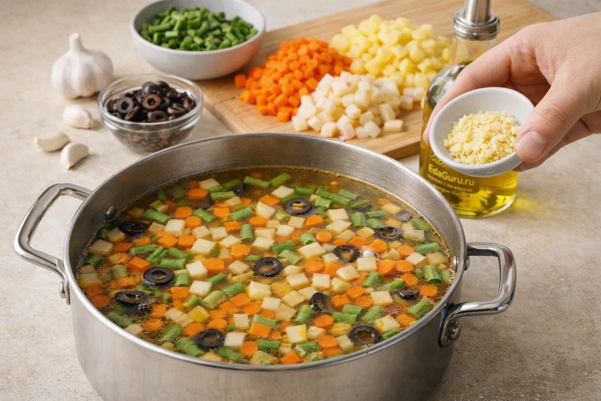 Очистите все овощи и нарежьте на небольшие кусочки, чеснок измельчить. Фасоль промойте и так же порежьте. Маслины подсушите и нарежьте кольцами. В бульон добавьте все овощи и варите их в течение 10-12 минут. Маслины и чеснок отложите.