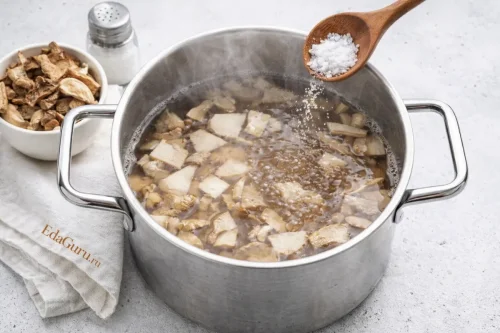 Сухие белые грибы положите в миску с холодной водой и оставьте на три часа для набухания. После этого промойте их, нарежьте на маленькие куски и переложите в кастрюлю, залив примерно 1,5 литрами чистой воды. Доведите до кипения, добавьте соль и варите на среднем огне около 25 минут. Обратите внимание, чтобы грибы не переварились, иначе они потеряют свою форму.