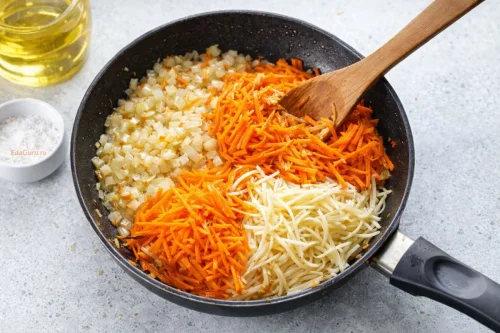 Пока готовятся другие ингредиенты, нагрейте сковороду, налив в нее 2 столовые ложки растительного масла. Положите нарезанный репчатый лук и обжаривайте его на среднем огне около пять минут, пока он не станет мягким. Затем добавьте к луку морковь и остальные овощи, не забывая помешивать, и продолжайте обжаривать еще примерно 5 минут. Следите, чтобы овощи не подгорели.