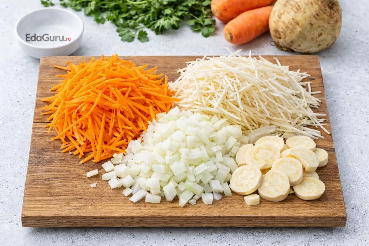 Подготовьте овощи. Сельдерей и морковь порежьте тонкой соломкой, а петрушку нарежьте кружочками, лук перьями. Обратите внимание, что для равномерного приготовления важно, чтобы все кусочки были примерно одинакового размера.
