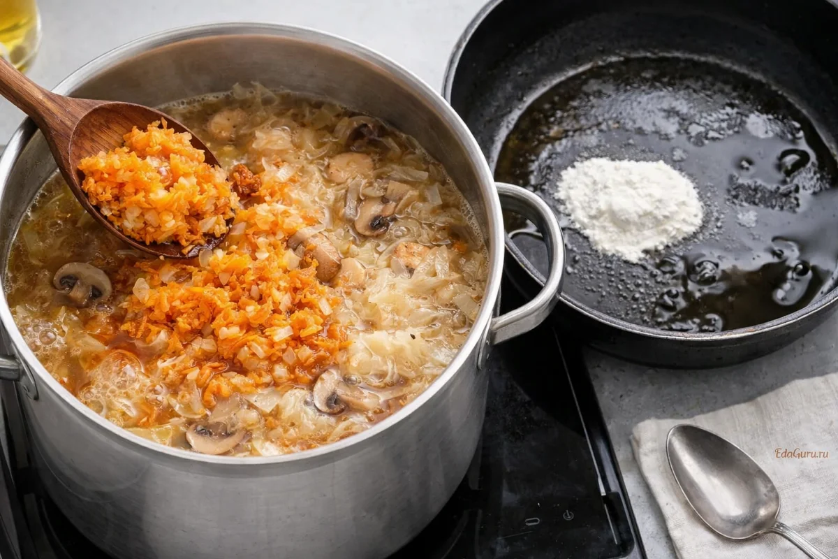 Если планируете добавить картофель, сначала отварите его с грибами почти до готовности, только потом добавьте квашеную капусту. Так же можно добавить нарезанную репу, если она есть в наличии. Томатная паста придаст усиленный вкус при обжарке овощей. Вместо пшеничной муки используйте ржаную, чтобы придать щам более исторический вкус.