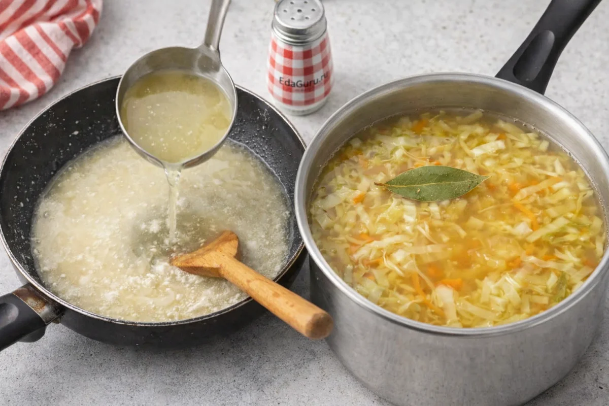 Обжарьте муку на сковороде в течение нескольких минут, после чего, постоянно размешивая, постепенно добавляйте немного бульона из кастрюли, чтобы избежать образования комков. Затем влейте эту мучную смесь в щи и положите лавровый лист для аромата.