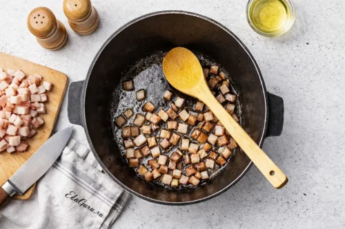 В казане разогрейте столовую ложку растительного масла и добавьте порезанное на куски сало. Обжаривайте их до тех пор, пока не вытопится жир. Масло необходимо, чтобы сало не прилипало ко дну и жарилось равномерно.